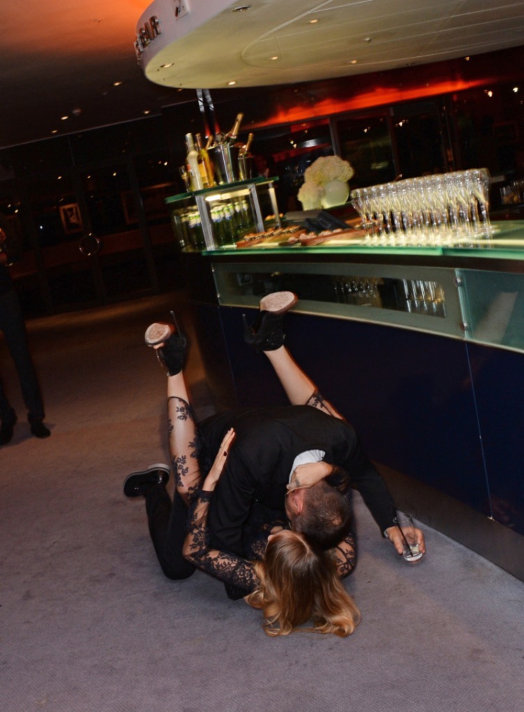 When she tried to hold onto him to prevent herself from falling, they both ended up on the ground, rolling around. Nevertheless, despite their expensive designer outfits getting dirty and disheveled, they managed to maintain their sense of humor in front of the cameras. Subsequently, Cara quickly stood up and hurriedly went to grab another beverage.