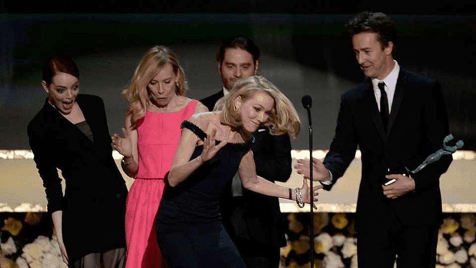 Upon hearing the news that Birdman had been nominated for a Screen Actors Guild Award for Outstanding Performance by a Cast in a Motion Picture, Naomi Watts made the decision to join the rest of the cast on stage during the party.
