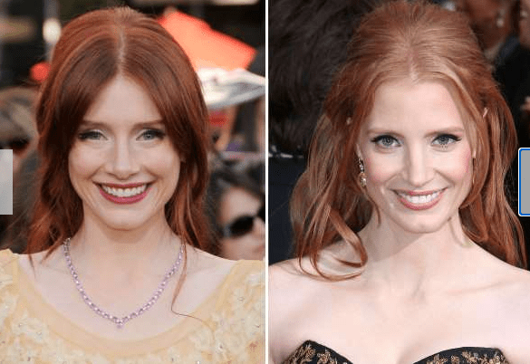 Jessica Chastain is widely known for her notable performances in various movies. However, it may surprise you to learn that Bryce Dallas Howard, another highly accomplished celebrity, bears a striking resemblance to her. These images showcase the remarkable similarities between these two individuals and highlight how astonishingly alike they appear.